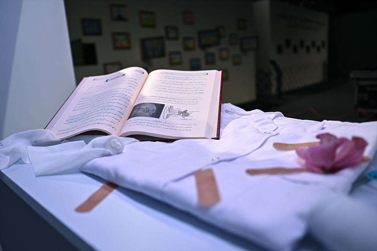 Ayrıca, “Yarım kalan ders” başlığıyla, zarar gören bir sandalyenin bulunduğu görsel, Filistin’deki bir öğrencinin eğitim yolculuğunun kesintiye uğradığını temsil ediyor. “Geleceğin kapısında kalanlar” başlıklı alanda ise yarım kalan eğitimlerin ve hayatların sembolü olarak diplomalar sergilendi. Duvarda, “Burada gördüğünüz her diploma, Filistinli öğrencilerin tamamlayamadıkları eğitim yolculuklarının ve gerçekleştiremedikleri meslek hayallerinin birer ifadesidir. Eğer yaşayabilselerdi, eğitim yuvaları yıkılmasaydı, bugün bu diplomalara sahip olacak, doktor, mühendis veya mimar olarak toplumlarına hizmet edeceklerdi” yazısı yer almakta.
