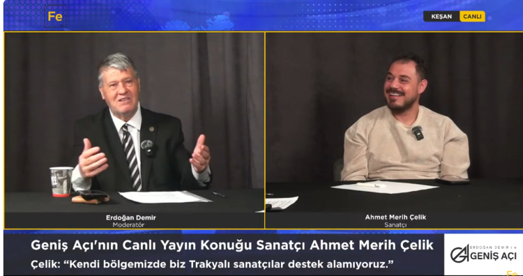 Mehmet AYTAÇ / EDİRNE (İGFA) – Trakya’nın sevilen sanatçılarından asma davul virtüözü Ahmet Merih Çelik, FE TV’de Erdoğan Demir’in sunduğu Geniş Açı programına konuk oldu. Kendini “Trakya’nın bağrından yetişen bir müzisyen” olarak tanımlayan Çelik, bölge müziğinin yıllardır yanlış tanıtıldığını belirterek, “Bizi roman havası çalan bir topluluk gibi görüyorlar ama Trakya müziği çok daha derin bir kültürün ürünü” ifadelerini kullandı.