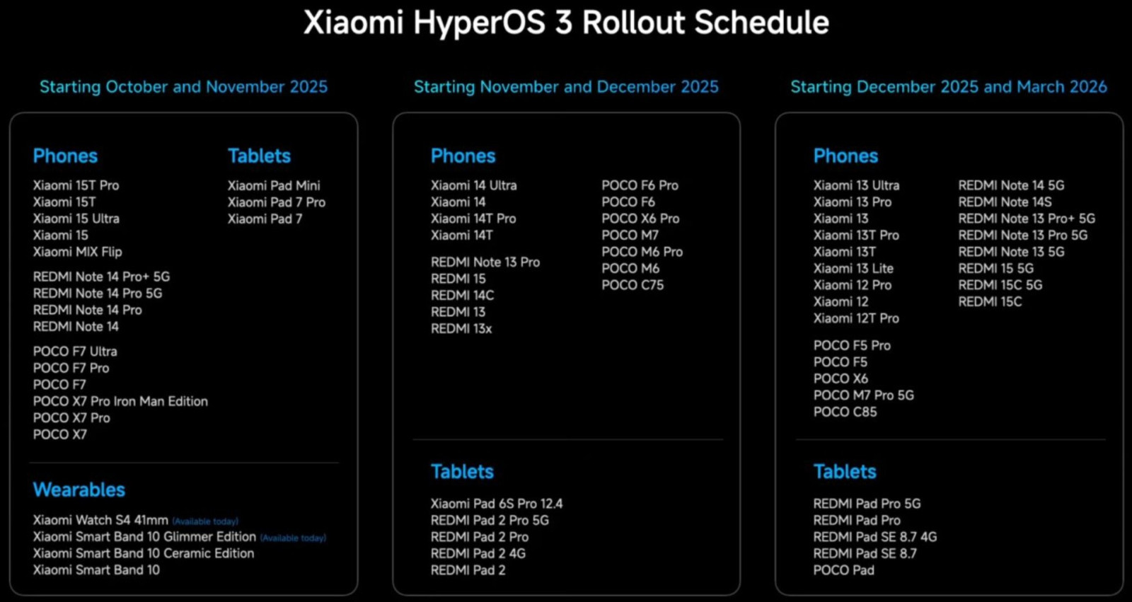 Xiaomi, güncellemeyi üç aşamalı bir planla yayına alıyor. Süreç Ekim 2025’te başlayacak ve 2026’nın ilk çeyreğine kadar devam edecek. Bu kademeli geçiş, cihazlarda daha sorunsuz ve dengeli bir güncelleme süreci sağlamayı amaçlıyor.