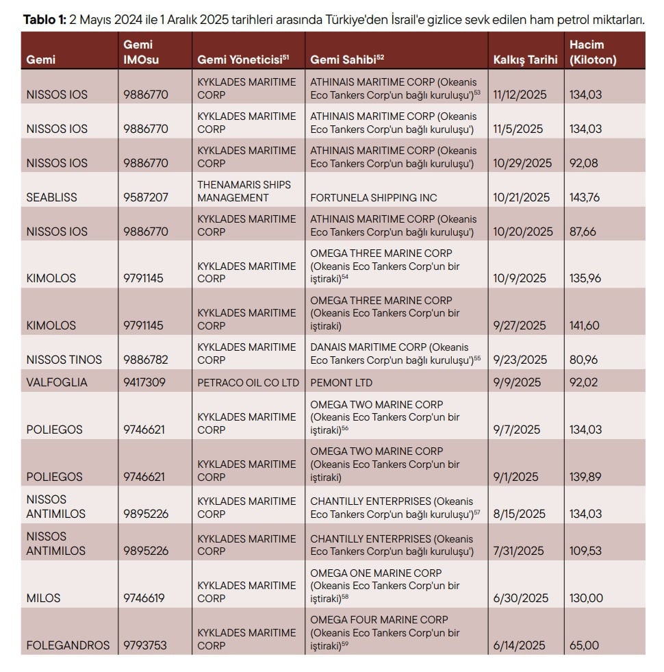 Hisselerinin çoğunluğu British Petroleum’a (BP) ait olan Bakü–Tiflis–Ceyhan (BTC) Boru Hattı üzerinden Azerbaycan ham petrolünün İsrail’e taşınmasına odaklanan raporda, 2 Mayıs 2024 ile 1 Aralık 2025 tarihleri arasında Türkiye’den İsrail’e giden tankerler ve taşıdıkları ham petrol miktarlarına ilişkin detaylı bilgiler aktarılıyor.