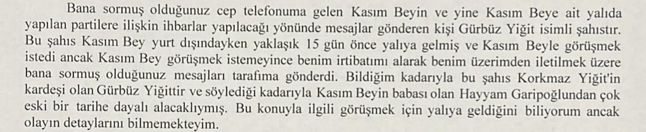 “Bana sormuş olduğunuz cep telefonuma gelen Kasım Bey’in ve Kasım Bey’e ait yalıda yapılan partilere ilişkin ihbarlar yapılacağı yönündeki mesajları gönderen kişi Gürbüz Yiğit isimli şahıstır. Bu şahıs Kasım Bey yurtdışındayken yaklaşık 15 gün önce yalıya geldi. Kasım Bey ile görüşmek istedi ancak Kasım Bey görüşmek istemeyince benim irtibatımı alarak benim üzerimden iletilmek üzere bana sormuş olduğunuz mesajları tarafıma gönderdi. Bildiğim kadarıyla bu şahıs Korkmaz Yiğit’in kardeşi olan Gürbüz Yiğit’tir ve söylediği kadarıyla Kasım Bey’in babası olan Hayyam Garipoğlu’ndan çok eski bir tarihe dayalı alacaklıymış.”